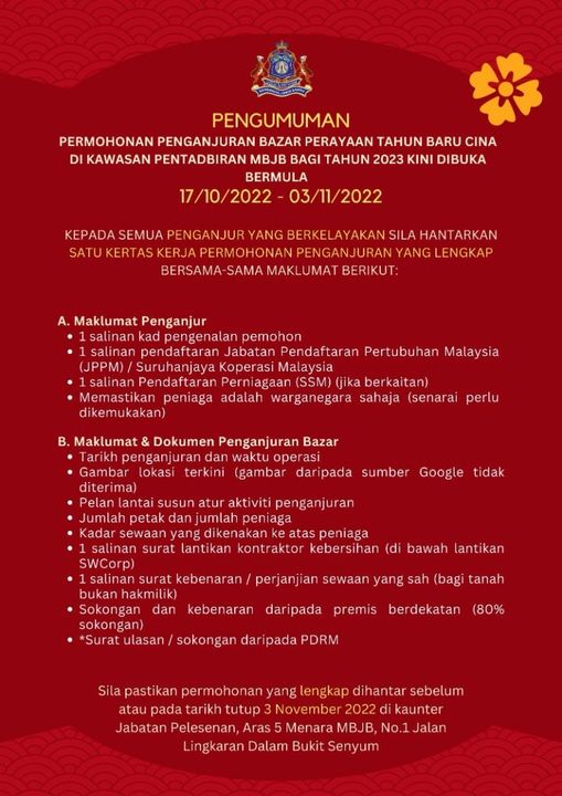 Permohonan Penganjuran Bazar Tahun Baru Cina Di Kawasan Pentadbiran Mbjb Mulai 17 Oktober 3 November 2022 Portal Rasmi Majlis Bandaraya Johor Bahru
